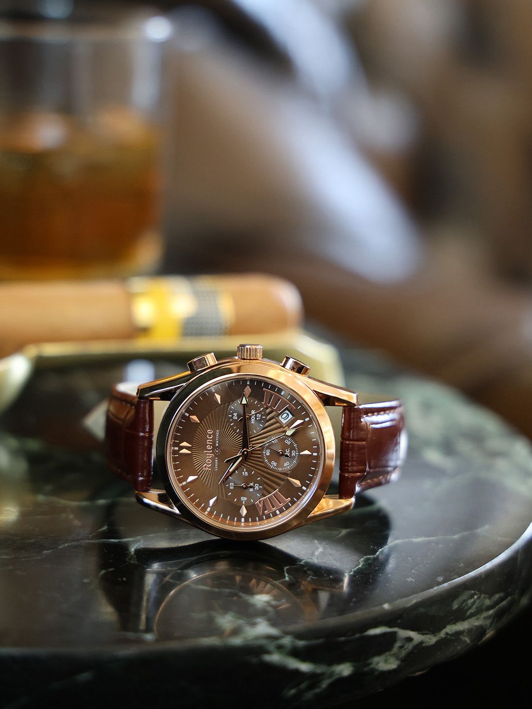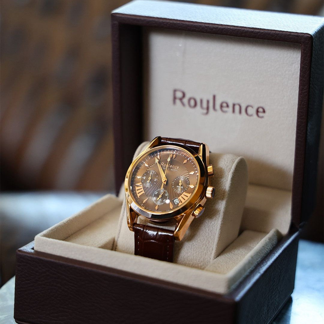 رقيقة، جريئة، وأنيقة دون جهد - ساعة روييلينس أونيكس روز ليست مجرد قطعة فاخرة؛ إنها إعلان عن الأسلوب. مصممة للرجل العصري الذي يقدر الدقة والأناقة، تتميز هذه الساعة كرونوغراف بسطح بني غني مزودًا مع علبة من الفولاذ المقاوم للصدأ مطلية بالذهب الوردي التي تنضح بالفخامة من كل زاوية.